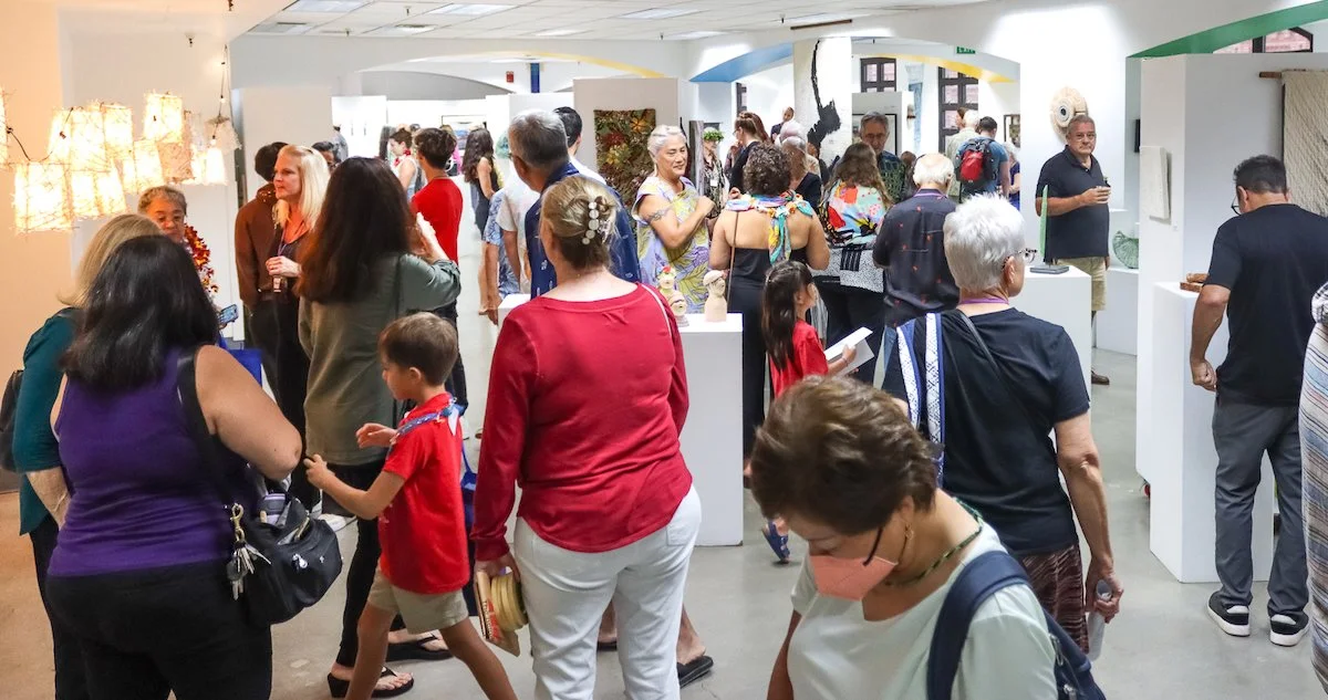 Two interviews with Casey Lund of Hawaii News Now took place in the gallery the morning of the opening. Below we are managing smiles at 6 AM . You can watch an interview HERE.